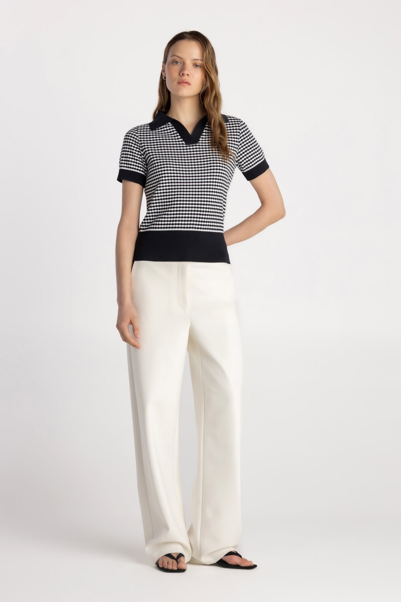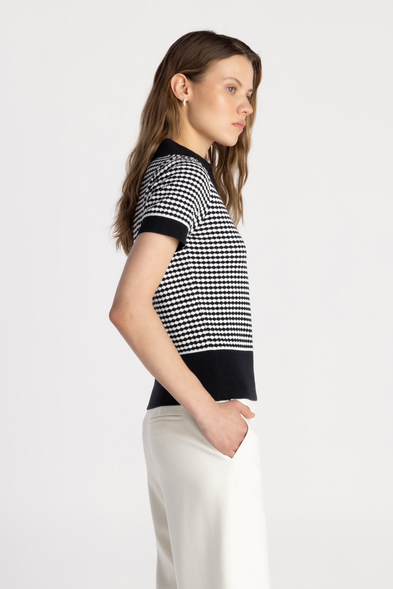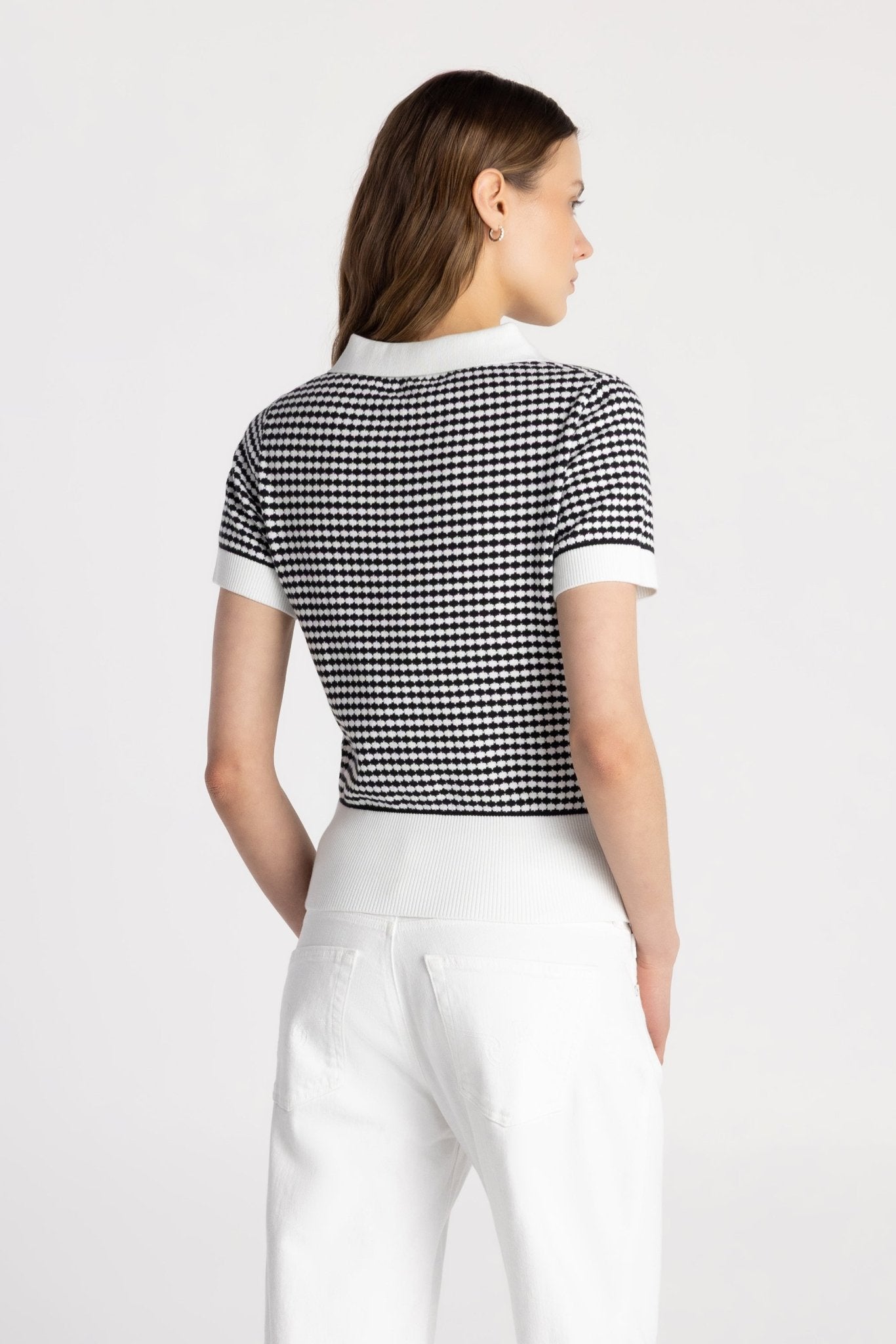 The Basic Knit Johnny Collar Polo blends timeless polish with modern texture. Crafted from a soft cotton-blend sweater knit, this fitted short sleeve silhouette features a two-tone scallop knit design for subtle dimension. A classic Johnny collar with a V-neck front opening creates a refined yet relaxed look, while contrast ribbed trim sharpens the finish. Designed for effortless styling, the Basic Knit Johnny Collar Polo transitions seamlessly from casual days to elevated everyday wear.