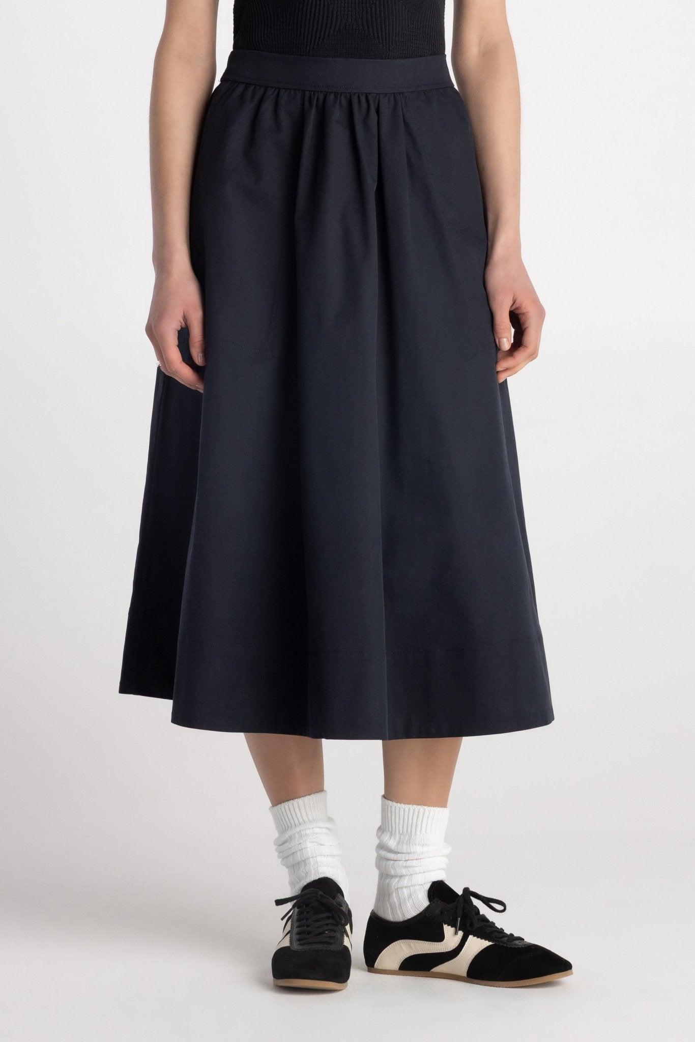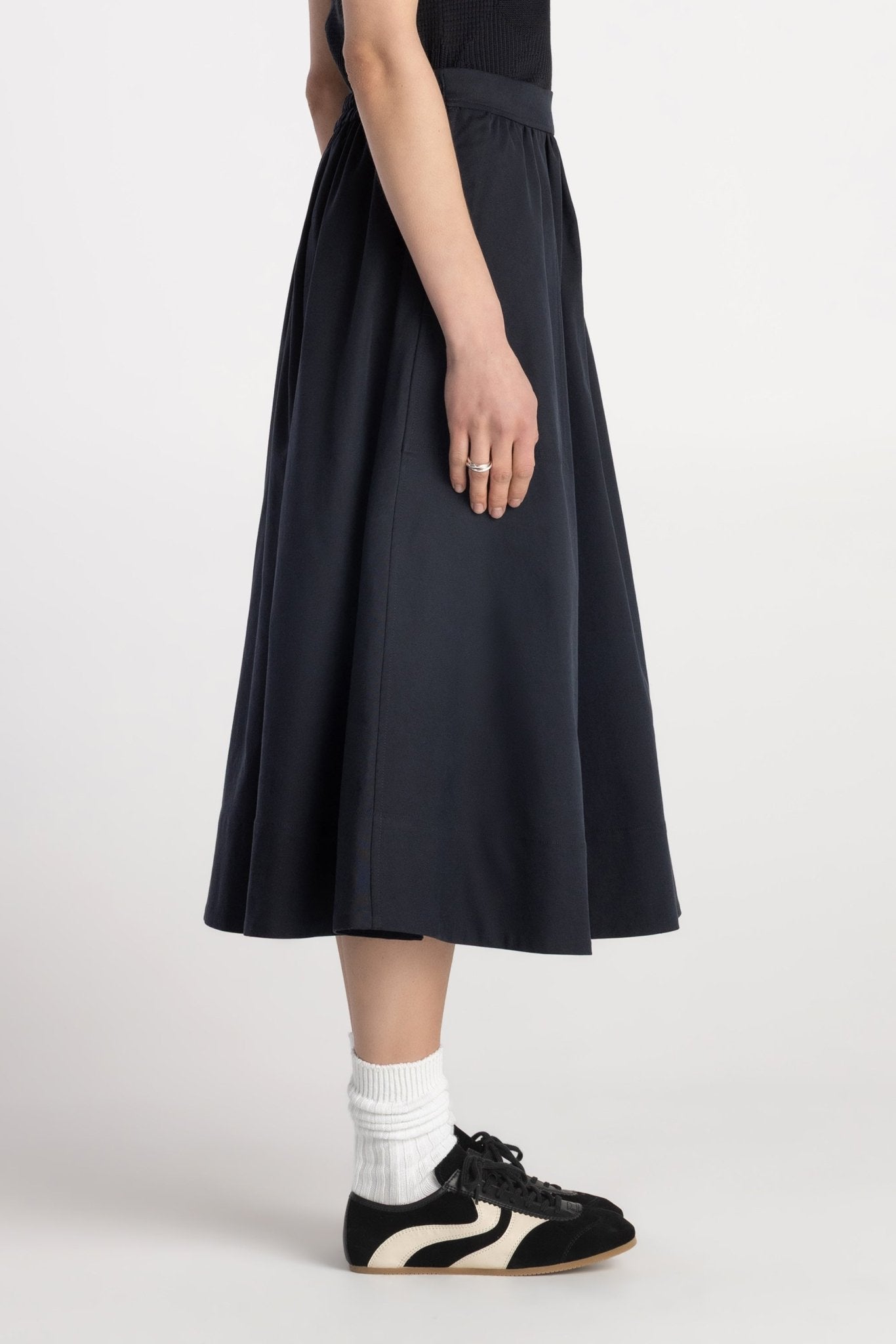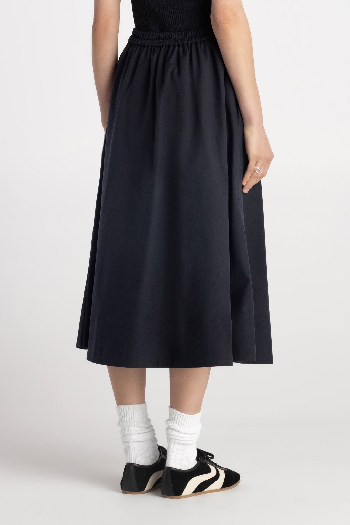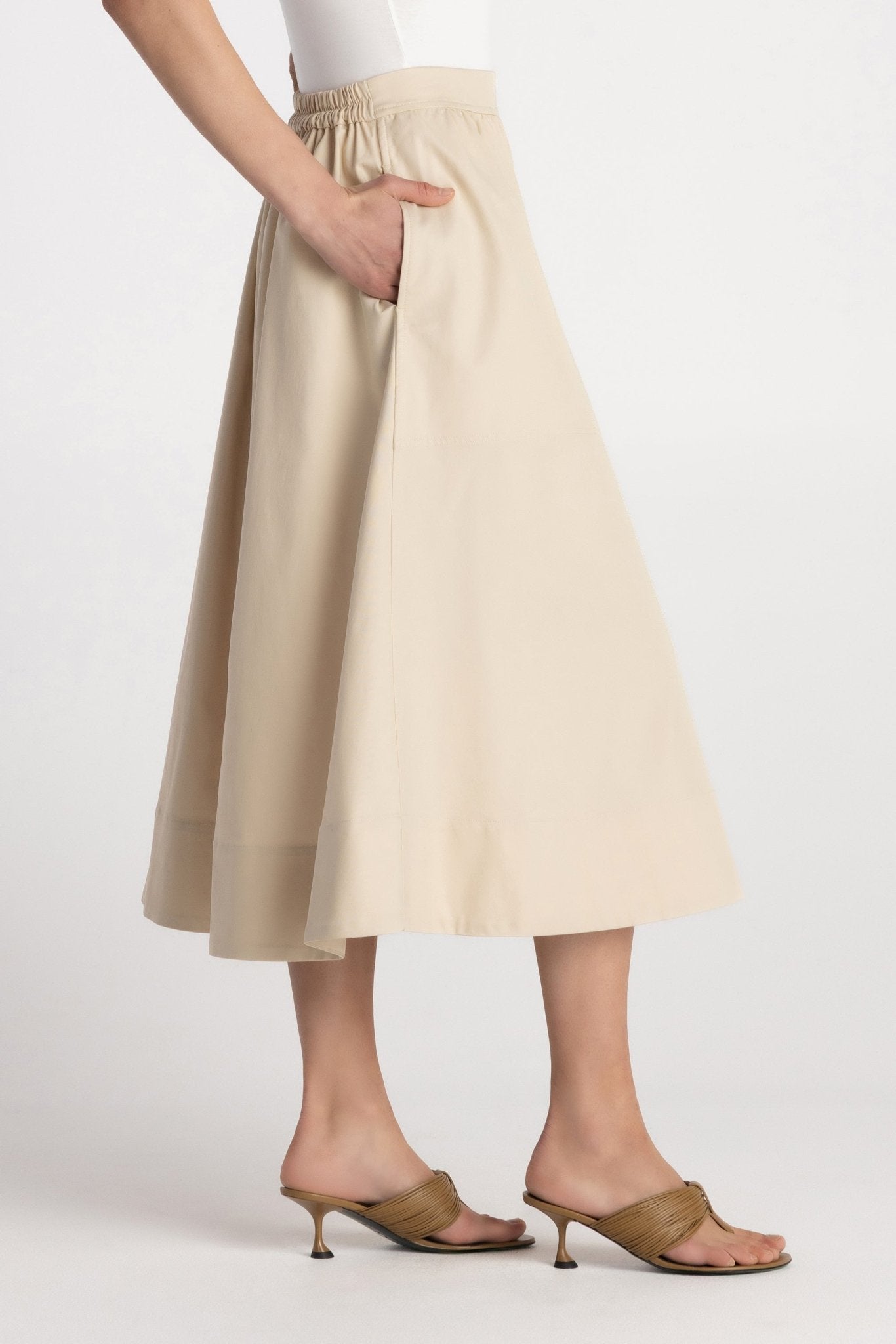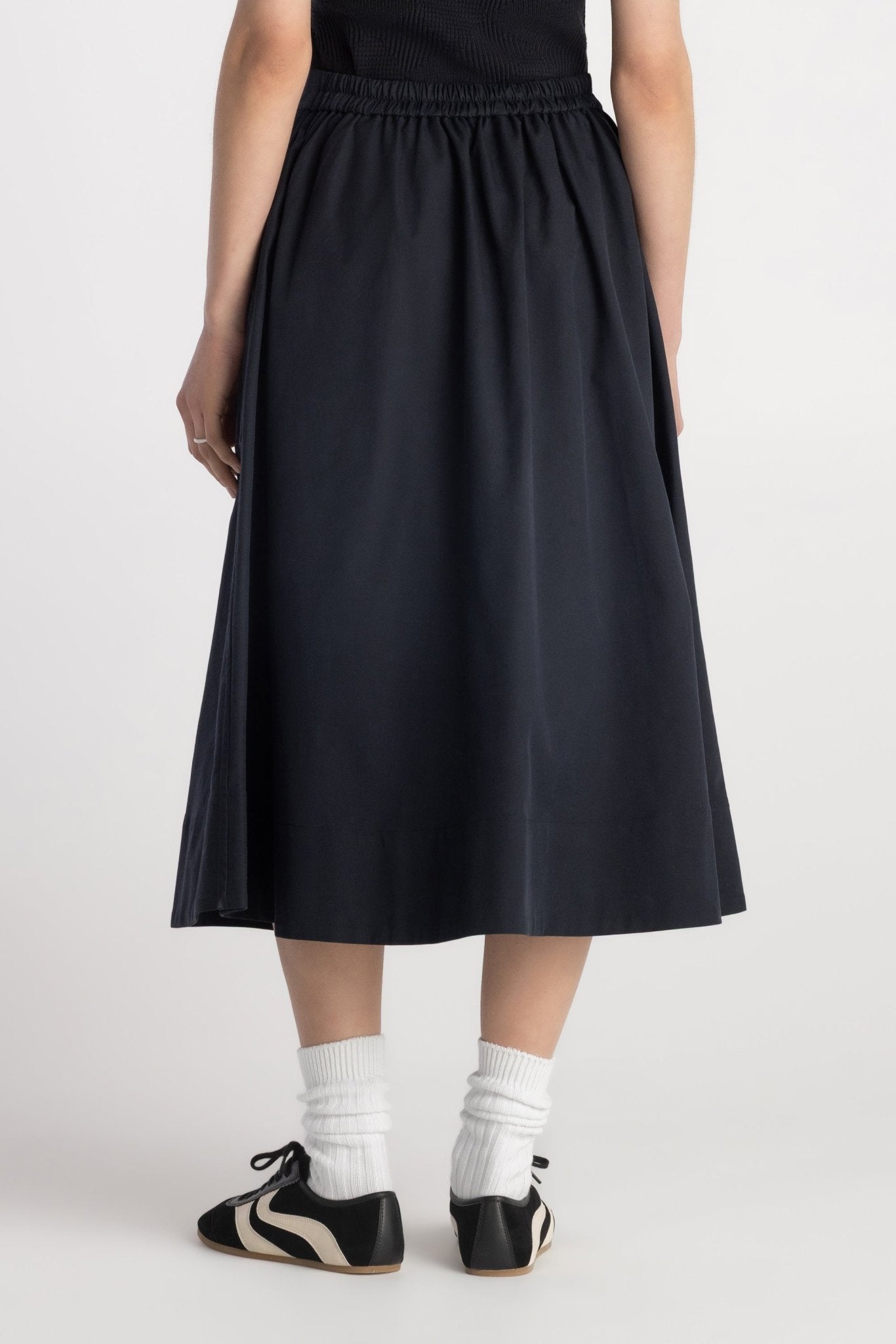 The Tindra Skirt brings effortless volume to everyday dressing. Crafted from smooth woven twill, this midi silhouette features a half-circular flare that creates soft movement with every step. Designed with a flat clean front waistband and elastic back for easy pull-on wear, it balances structure with comfort. Side pockets add practicality, while the wide hem detail enhances the skirt’s modern shape. The Tindra Skirt transitions seamlessly from work to casual styling with refined ease.